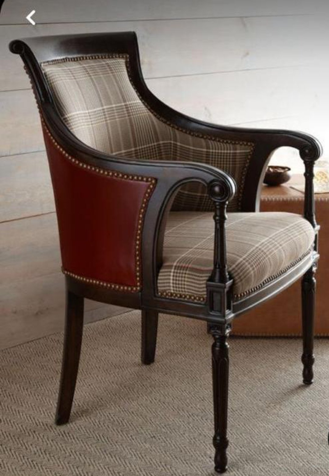 Classic Vintage Armchair with dark wood frame, carved legs, and brass nailhead accents. Features a comfortable beige plaid seat cushion and luxurious red leather side panels. Perfect for stylish bedroom décor.